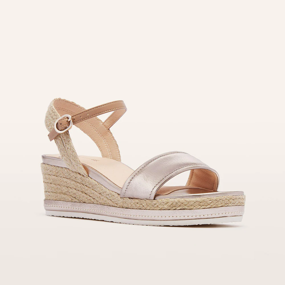 A wedge with a little extra sparkle—Harris in luminous Champagne lifts your warm-weather style with effortless elegance. Crafted with classic jute finish detailing, soft metallic leather, and refined, contrasting straps, this elevated heel is equal parts polish and ease. Designed with our podiatrist-designed footbed, triple-layered cushioning, and over a centimetre of forefoot padding, Harris delivers shimmering style without compromising on all-day comfort.